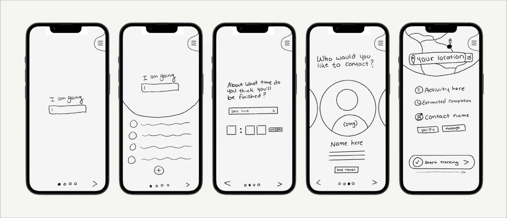 Initial sketches and wireframes revealed confusion from similar screens and unclear emergency access. The second iteration consolidated flows, simplified the UI, and made the SOS button persistently accessible with strong visual prominence.