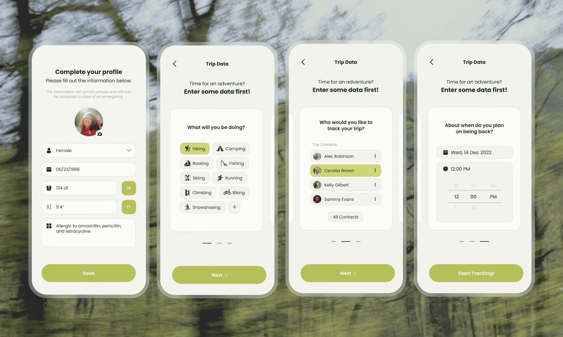 Trip onboarding collects details about the trip a user wants to track. New users first complete a profile setup (also accessible later in settings), while trip details are entered each time a new trip begins.